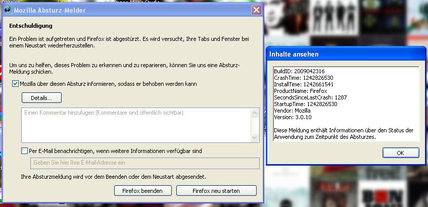 seit zwei Tagen klemmt mein Firefox 3.10. Wenn ich ihn starte, erscheint sofort der Mozilla Absturzmelder; Firefox selbst taucht gar nicht mehr auf. Auch eine Neuinstallation hat nicht geholfen.