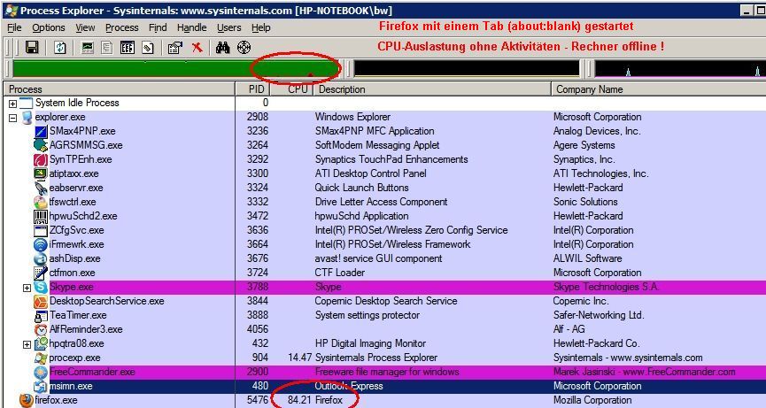 Beim Überprüfen stelleich imer wieder fest, dass es fast ausnahmslos der FF ist, der die Prozessorauslastung bis teils auf über 90% hochschraubt, dies aber nicht permanent sondern sporadisch, manchmal alle 2-3 Minuten, manchmal dauert es etwas länger, allerdings jedoch ist die CPU dann immer voll ausgelastet!