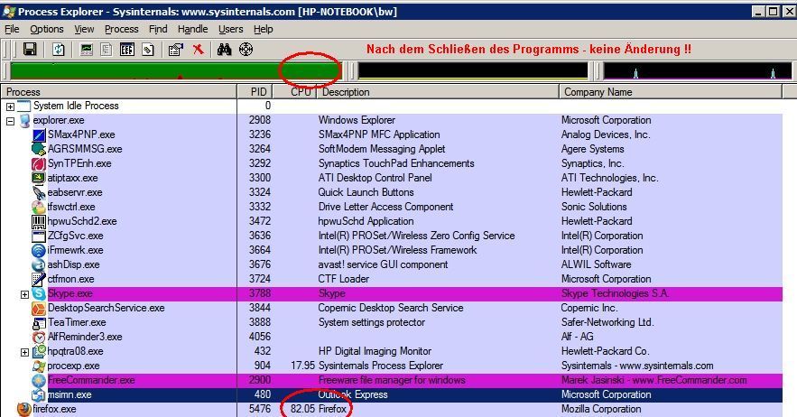 Was mich am meisten verwunderte, war die Tatsache, dass nach Schließen von FF die CPU immer noch teilweise zu 100% ausgelastet wird.