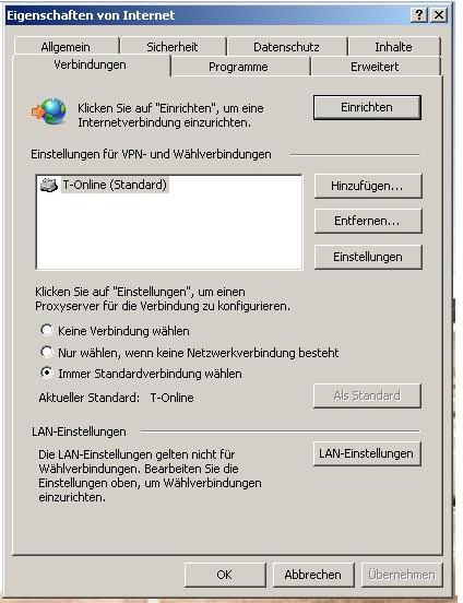 Nun ist die Frage, wie Du überhaupt eine INet-Verbindng herstellst. Über eine Wählverbindung, wie hier am Beispiel des IE8 dargestellt......