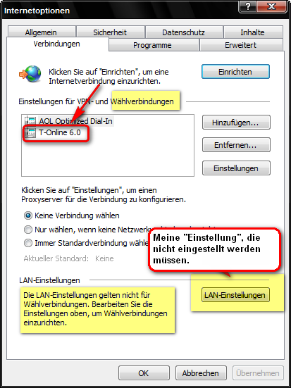Der IE 8 verbindet sich übrigens automatisch nach dem Klick auf das Icon, es erscheint kein Fenster mit Abfrage nach einer Verbindung.So sieht bei mir die Einstellung aus, um eine Verbindung über Modem und T-DSL herzustellen:[attachment=0]Verbindung.JPG[/attachment]