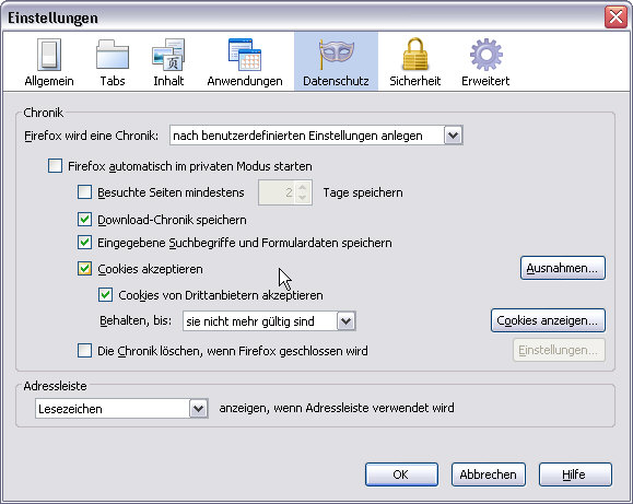 Bei "Firefox im privaten Modus starten" ist kein Kreuzchen...und bei "die Cronik löschen, wenn Firefox geschlossen wird", ist auch kein Kreuzchen