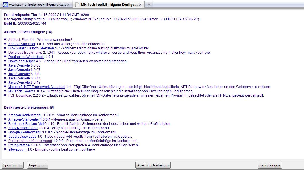 hab mich wohl zu früh gefreut. Kann es angehen, dass o.g. Tipp "Eigene Konfiguration" anzeigen mit dem Fx 3.5.1 nicht funktioniert? Bei mir wird bei Aufruf nur ein leeres Fenster angezeigt!