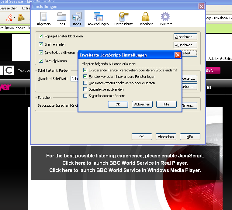 In NoScript muß zumindestens "bbc.co.uk" und "bbcimg.co.uk" freigegeben werden, in Firefox natürlich auch JavaScript aktiviert sein..
