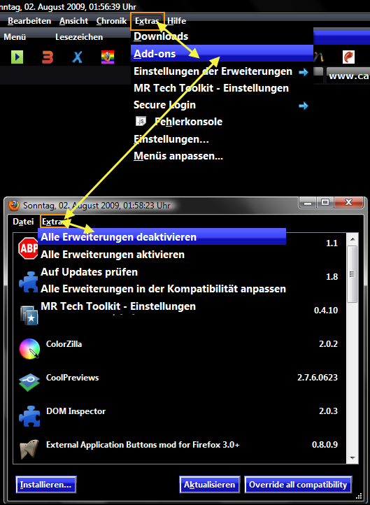 Extras > Addons > Extras > Alle Erweiterungen deaktivieren