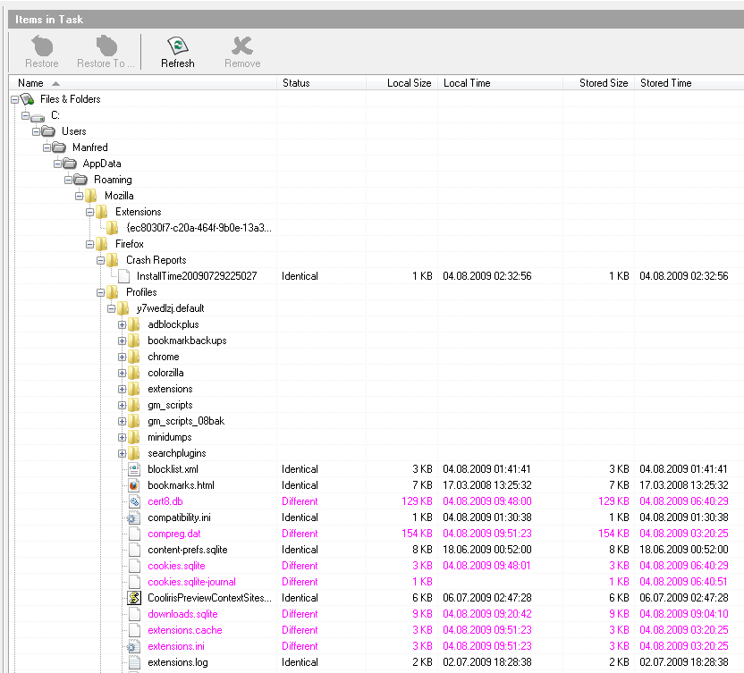 Unter Stored Time steht, wann die im Backup gespeicherte Datei zuletzt auf dem Rechner (also vor dem Backup) geändert wurde; Local Time zeigt den das Gleiche für die im Originalordner liegende Datei, die durchaus nach dem Erstellen des Backup (z.B. beim Starten des Firefox) einen neuen Zeitstempel bekommen kann.