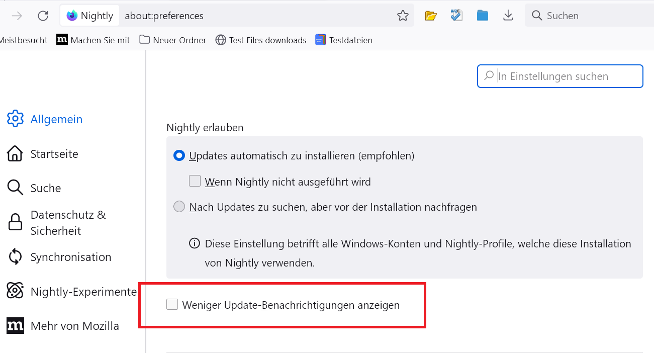 Ich habe ihn jetzt mal gesetzt! Wenn ich Nightly erstmalig am Tag aufrufe, wird oben rechts via PopUp ein zu installierendes UpDate angekündigt. Vielleicht erscheint dann diese Mitteilung nicht mehr jedesmal. Es finden ja meistens 2 UpDates am Tag statt so das dann das Nachmittags-UpDate nicht mehr angezeigt wird.. ![]()
