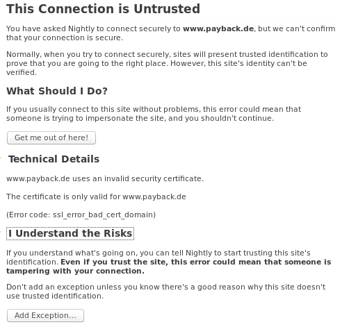 http://www.payback.de uses an invalid security certificate. The certificate is only valid for http://www.payback.de (Error code: ssl_error_bad_cert_domain).