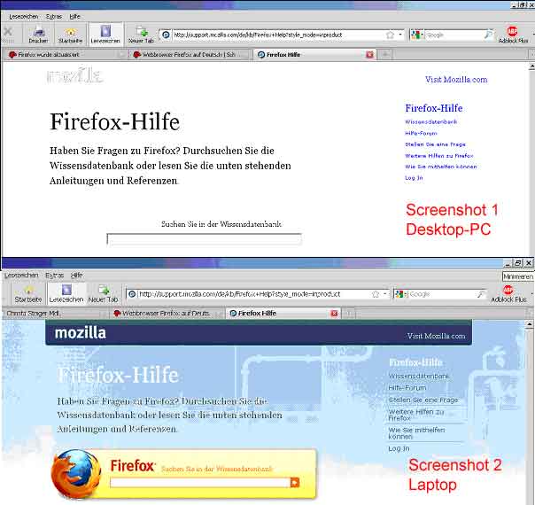 Seit heute werden Webseiten mit Hintergrundgrafik auf meinem Dektop-PC (Fujitsu-Siemens, XP professional) vom Firefox 3.5.3 nicht mehr richtig dargestellt. Im Internet Explorer und anderen PCs mit Firefox ist die Darstellung OK. - (siehe: screenshot Firefox.jpg ) - FF wurde neu installiert und Versuche nach FirefoxWiki waren erfolglos. Der Cach läßt sich nicht löschen (jedenfalls kann ich es nicht finden - bei einer älteren Version war diese Möglichkeit vorhanden!)