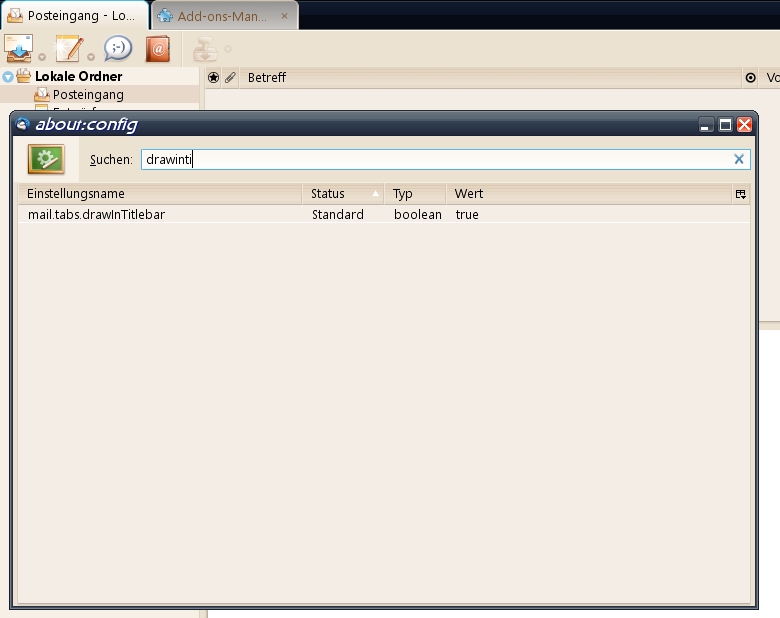 Zitat von edvoldibird hat in seiner Erweiterung " mail.tabs.drawInTitlebar auf false" stehen da sollte die Titelleiste zusehen sein.