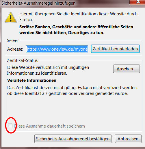 keine dauerhafte Speicherung von Sicherheits-Ausnahmeregeln