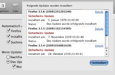 Firefox 3.5.6 (20091201203240) Sicherheits Update Installiert am: 1.Januar1970 01:00:00 Status: Das Update wurde erfolgreich installiert.