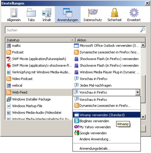 ich habe gerade auf Winamp 5.57 upgedatet und jetzt habe ich im Firefox 3.5.6 die RSS Feeds mit Winamp verknüpft.