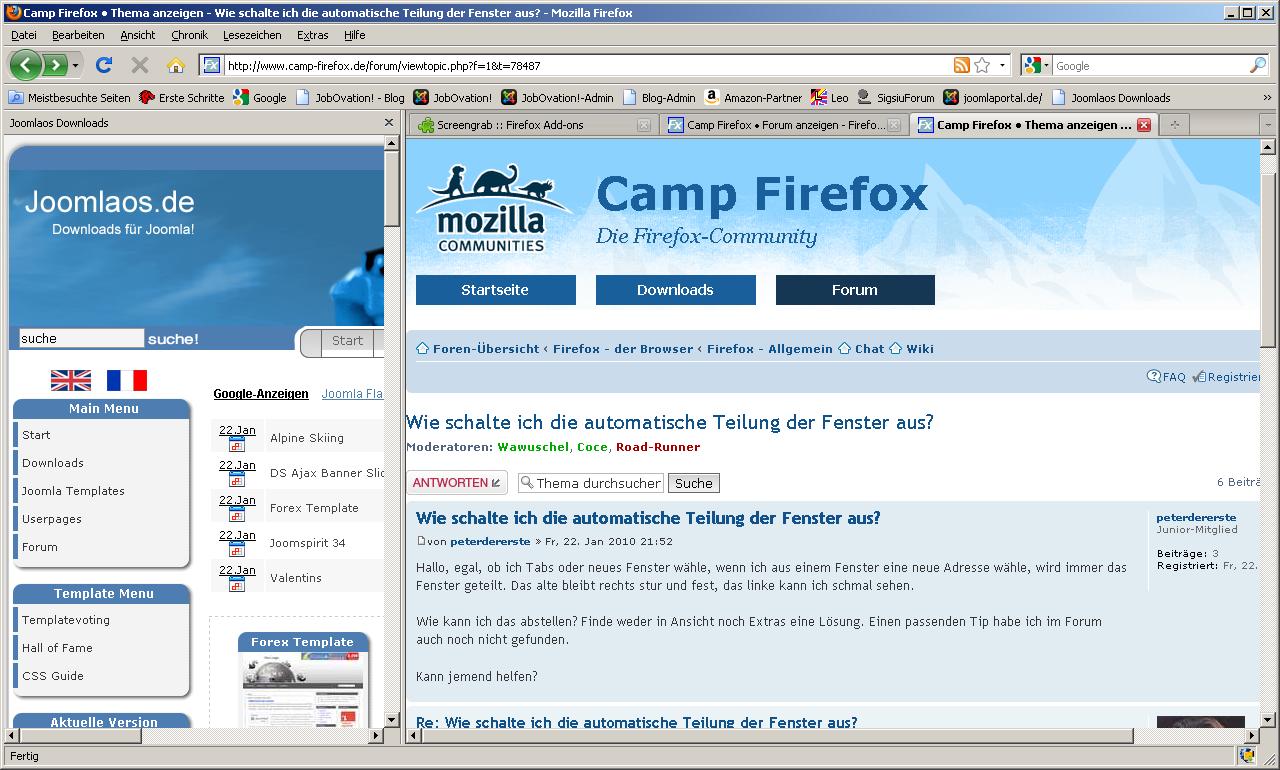 Hallo, egal, ob ich Tabs oder neues Fenster wähle, wenn ich aus einem Fenster eine neue Adresse wähle, wird immer das Fenster geteilt. Das alte bleibt rechts stur und fest, das linke kann ich schmal sehen.