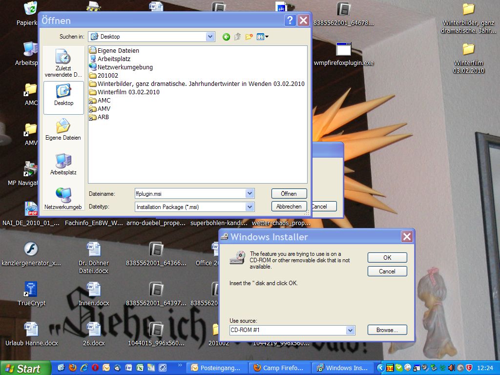 Du hast das Firefoxplugin als Datei vorliegen/abgespeichert? Dann klicke im Installerfenster auf Browse und navigiere zum Speicherort. Warum du einen englischen Installer hast, weiss ich nicht.