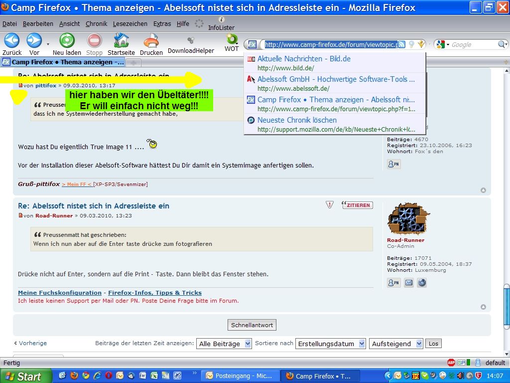Wenn Du mitgelesen hättest, wüsstest Du, das die Programme bereits deinstalliert sind und dass ich ne Systemwiederherstellung gemacht habe, die Chronik nochmals gelöscht habe - und dennoch ist die blöde Abelssoftware immer noch in der Adressleiste.