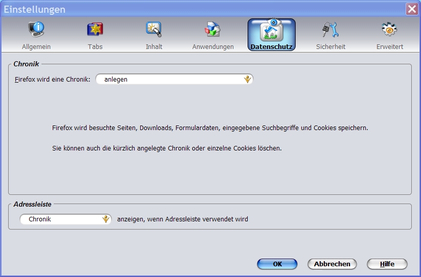 • Abelsoft ist jetzt weg. Aber wenn ich in denEinstellungen eingebe "Chronik anlegen", klicke ich das Fenster nur schnell mal weg und hol es wieder her. Was sehen wir: Aus Chronik anlegen ist benutzerdefiniert geworden. Hatte ich aber gar nicht eingestellt. Wer weiß Rat?[attachment=1]sss.jpg[/attachment] Meine Einstellungen zu Beginn.[attachment=1]sss.jpg[/attachment] die geänderten Einstellungen.
