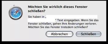 Im Safari Browser gibt es eine Prüfung, ob Eingaben in den Feldern gemacht worden sind. Wenn das dann der Fall ist, kommt ein Hinweis von Safari (Siehe Screenshot) ob Safari wirklich geschlossen werden soll?