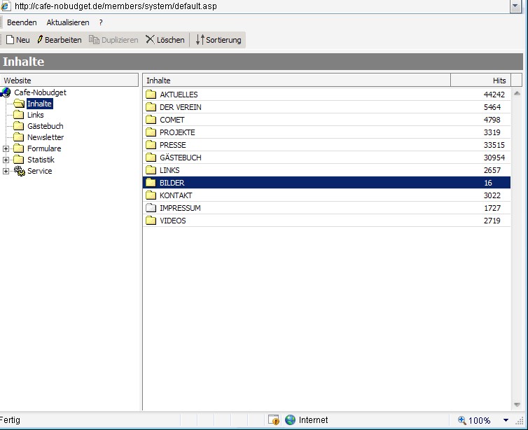 Mein Problem ist folgendes ich kann wenn ich mich bei unserem Hompageanbieter einlogge und dann unsere Seite bearbeiten will dann geht das nicht es fehlen die Symbole die ich brauche um neue Sachen zu erstellen. Ich habe mal ein Bild im Anhang wie es aussehen soll das ist vom Internet Explorer. Es geht um die Schaltflächen Neu Bearbeiten Löschen und Sortieren. die sind beim Firefox nicht sichtbar. Wenn ich die Ordner öffne und dann auf ein vorhandenes projekt klicke wird dies auch nicht mehr geöffnet. das ging aber mal .ich benutze den firefox 3.6.3 kann mir da jemand helfen. Achja ich weiss auch nicht ob mein Thema richtig um schrieben ist weil ich nicht weiss wie die genaue Bezeichnung der Schaltflächen ist.