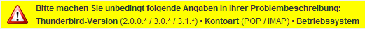 In dieser Frage bin ich zu 100% deiner Meinung. Ich glaube, daß es schwer fallen dürfte irgendwo eine Bitte zu finden, die so generell mißachtet wird wie diese. Deswegen habe ich schon in der Vergangenheit dafür plädiert, dieser "Bitte" - ich würde eine Aufforderung daraus machen - mehr Nachdruck zu verleihen, auch in der Art der Darstellung. AFAIK haben die Kollegen vom Thunderbird-Forum da eine sehr nachdrückliche Version (siehe Anlage).Zitat von PaxiZu "meinem" Thema: