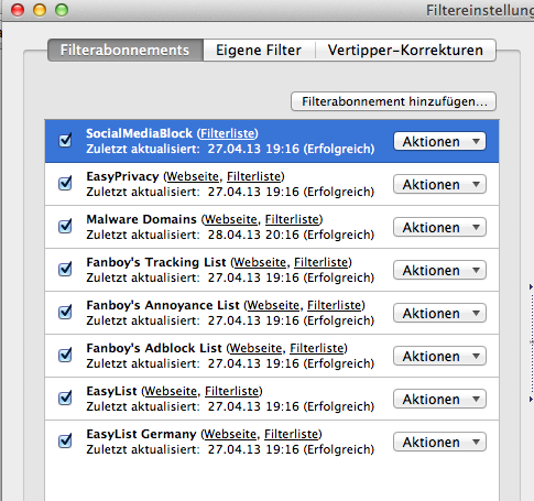 - Fanboy's Adblock List (besser direkt zu "EasyList+Fanboy's List test subscription" greifen und dann auch EasyList entfernen)