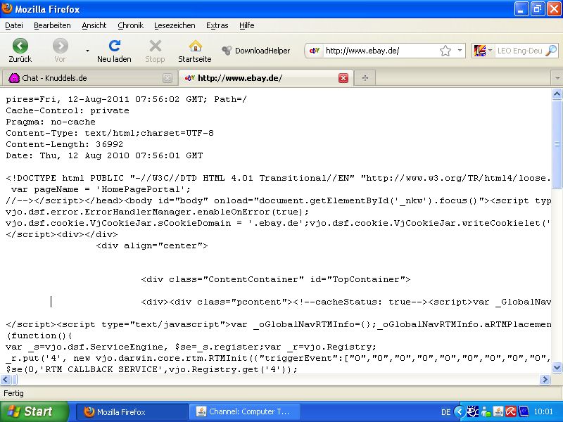 • Tut mir einen Gefallen und helft mir BITTE!!!...Ich habe seit gestern das Problem, dass ich mit dem Firefox jede beliebe Seite ohne Schwierigkeiten öffnen kann, aber die Seite ebay.de wird nicht angezeigt. Stattdessen wird sie so, wie in dem Dateianhang zu sehen, angezeigt. Ich hab Firefox x-mal deinstalliert, frisch downgeloadet (Vers. 3.5.x und auch 3.6.x) und neu installiert, habe cookies und cache geleert, Benutzerprolie gelöscht... aber das Problem besteht weiterhin. Ich hoffe, dass euch diese Angaben helfen und dass Ihr mir weiterhefen könnt...Vielen Dank Euer Gerdi