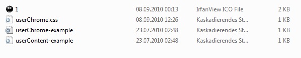 Ich SPEICHERE und KOPIERE den Ordner in C:/benutzer/benutzername/appdata(hab ich sichtbar gemacht)/roaming/mozilla/firefox/profiles/x8v6kmqc.defaults/chrome. Dort LASSE ich die beiden exampel-Ordner (userChrome-example u. userContext-example). Dann schließe ich den FF, öffne den erneut und es passiert ... NIX ![]()