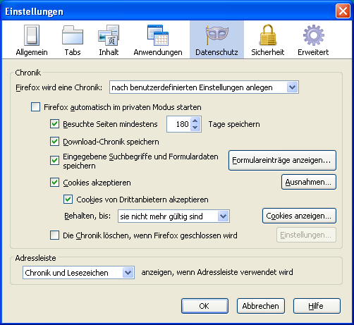 Interessant ist, dass die Form-Daten in der formhistory.sqlite gespeichert werden. Die Datei wächst bei Gebrauch und auch mit dem Add-On "Form History Control" sieht man die gespeicherten Eingaben auch nach einem Neustart, sie werden eben nur nicht genutzt.