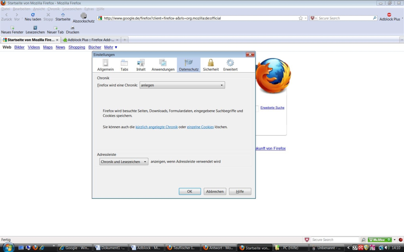 Das Problem ist, dass bei mir in der Version FF 3.6.10 gar keine Möglichkeit besteht unter Datenschutz überhaupt Haken setzen zu können.