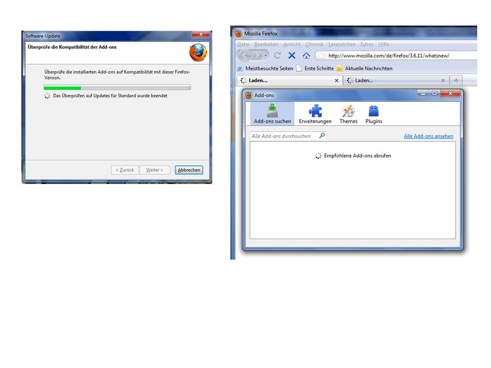 Wenn ich bei diesem Überprüfungsdialog auf Abbrechen klicke und dann FF 3.6.11 aufrufe, bleibt er in dem Zustand hängen, dass er weder die initial aufzurufenden Seiten als auch eine angegebene Website anzeigen kann und immer im Zustand "Laden" bleibt.