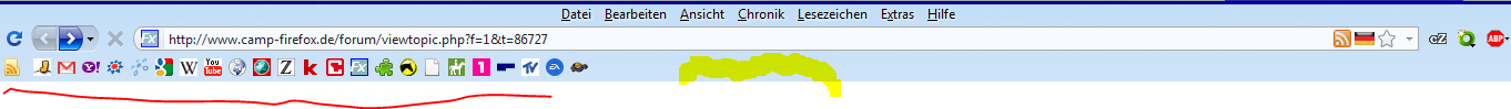 Also ich habe bei allen 3 Leisten einen Haken drin, dann über Anpassen die Adress/Suchleiste in die Menüleiste verschoben. Dann die Lesezeichen-Symbolleiste in die Navigations-Symbolleiste verschoben und dann den Haken bei Lesezeichen-Symbolleiste entfernt. Dann sieht das so aus.[Blockierte Grafik: http://www5.pic-upload.de/thumb/22.01.11/wmlzk7xtez9c.jpg]