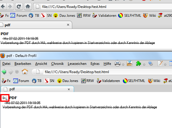 Der IE7 und IE8 zeigen und drucken das korrekt. Der aktuelle FF zeigt es korrekt, druckt es aber falsch: Der Text wird in andere Buchstaben umgewandelt, alle in Grosschreibung und vermischt mit Sonderzeichen. Die Durchstreichung selbst ist OK.