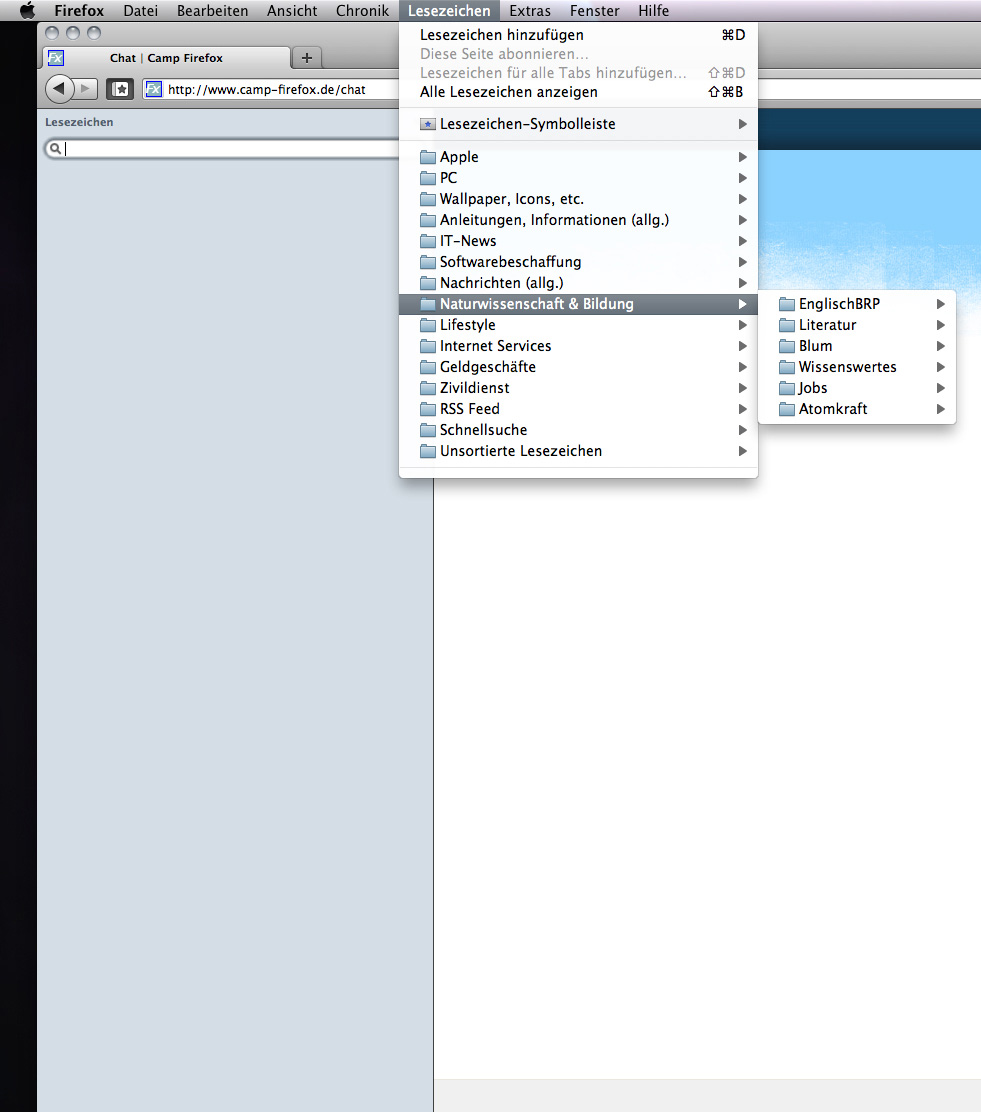 mein Firefox zeigt die Lesezeichen in der Seitenleiste nicht an. Im Dropdownmenü jedoch werden sie angezeigt. (Screenshot liegt im Anhang)