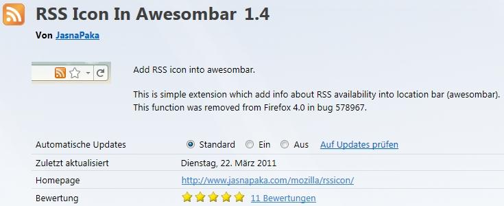 hätte ich gerne auf "social media apps" im Firefox (Roadmap) verzichtet und vielleicht bei mir und bei Freunden zusätzlich zum Testpiloten iMacros installiert und mit simulierten Clicks das rss-Icon in der Awesome-Bar favorisiert. :wink:
