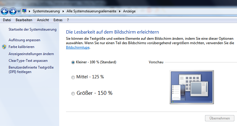vielleicht kann jemand mal einen screenshot einstellen wie die einstellung sein solllte. (da mein betriebssystem in portugiesisch ist, da ich in brasilien lebe und der laptop dort gekauft wurde).ich habe an der aufloesung nichts geaendert und mit ff 3.6 hat alles geklappt. groesser zoomen kann ich jetzt ja auch mit ff 4 (mit den plus/minus tasten) aber sobald ich die seite wechsel ist die darstellung wie so klein????????f