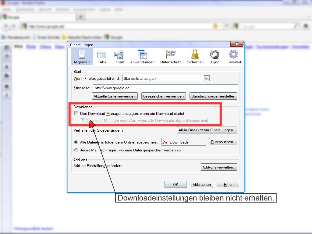3. Einstellungen für das Downloadverhalten werden zwar übernommen, sind jedoch nach Neustart von Firefox wieder "zurückgesetzt".