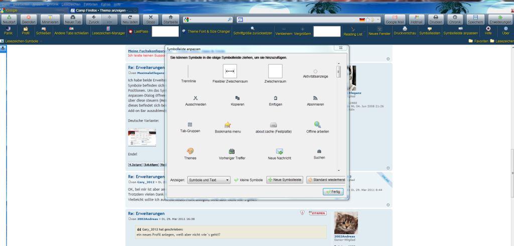 Bei mir gibt´s das aber nicht............sowohl für die Erweiterung "PlainOldFavorites" als auch für die Erweiterung "Theme Font & Size Changer 0.8" gibt´s kein Icon unter "Symbolleiste anpassen". Das Problem tauchte eigentlich erst mit den neuesten Versionen der Erweiterungen auf. Habe auch schon die 2 Erweiterungen deinstalliert und dann nach dem Neustart des Browsers wieder neu installiert, allerdings mit dem selben (Nicht-)Erfolg............bin ratlos?