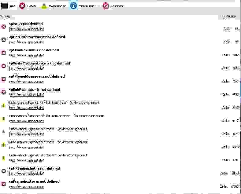 Ich hab mal zwei Screenshots beigefügt, einer zeigt die aktuelle Darstellung von spiegel.de, die andere die dazu passenden Meldungen der Fehlerkonsole.