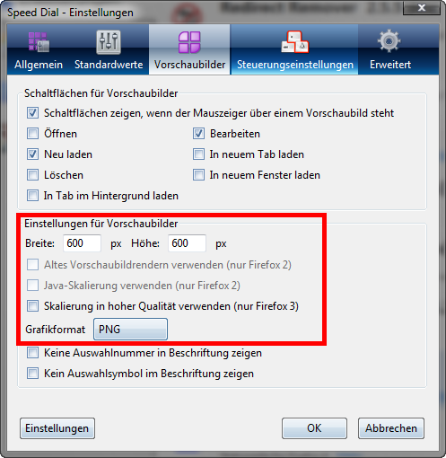 Vielleicht irgendwas an den Standardwerten der Größenvorgaben in den Speed Dial-Einstellungen ändern?