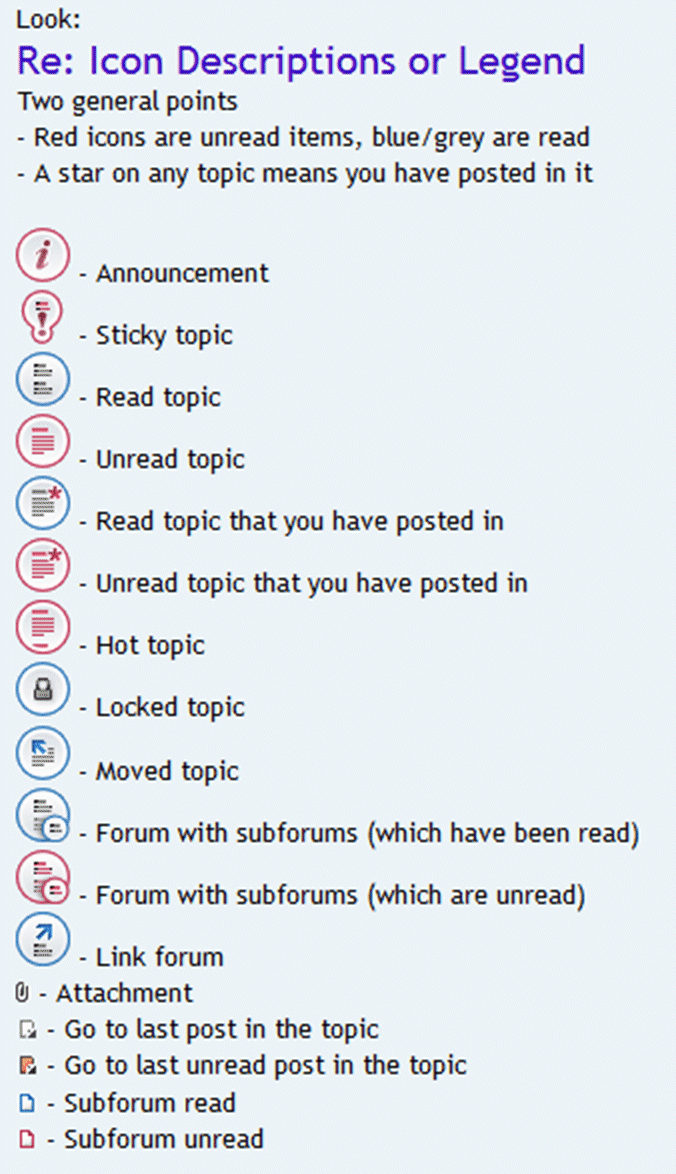 Das einzige, was ich davon mitgekriegt habe, ist, dass offenbar ein rot eingefärbtes Icon ein ungelesenes und ein blau eingefärbtes ein gelesenes Thema, ein Stern ein Thema anzeigt, in dem ich gepostet habe. Das würde mir aber auch nicht viel helfen, wenn der Screenreader diese Grafik nicht in Text umsetzen kann.