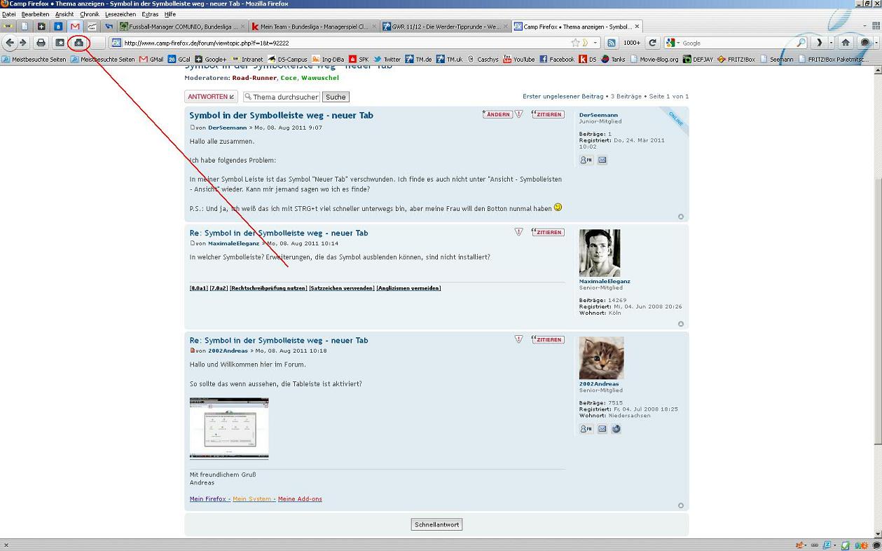 In meiner Symbol Leiste ist das Symbol "Neuer Tab" verschwunden. Ich finde es auch nicht unter "Ansicht - Symbolleisten - Ansicht" wieder. Kann mir jemand sagen wo ich es finde?