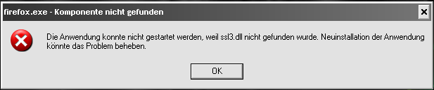 Wenn ich dann auf OK klicke passiert nichts. Ebenso hab ich schon diese Datei namens "ssl3.dll" auf dem PC gesucht und gefunden. Ich hab Firefox auch deinstalliert und wieder installiert, aber wie dort schon genannt ist, könnte das Problem dadruch behoben werden. Mein Rechner macht ebenso noch 1-2 mal Tick-Geräusche, nachdem ich versucht habe Firefox zu öffnen.