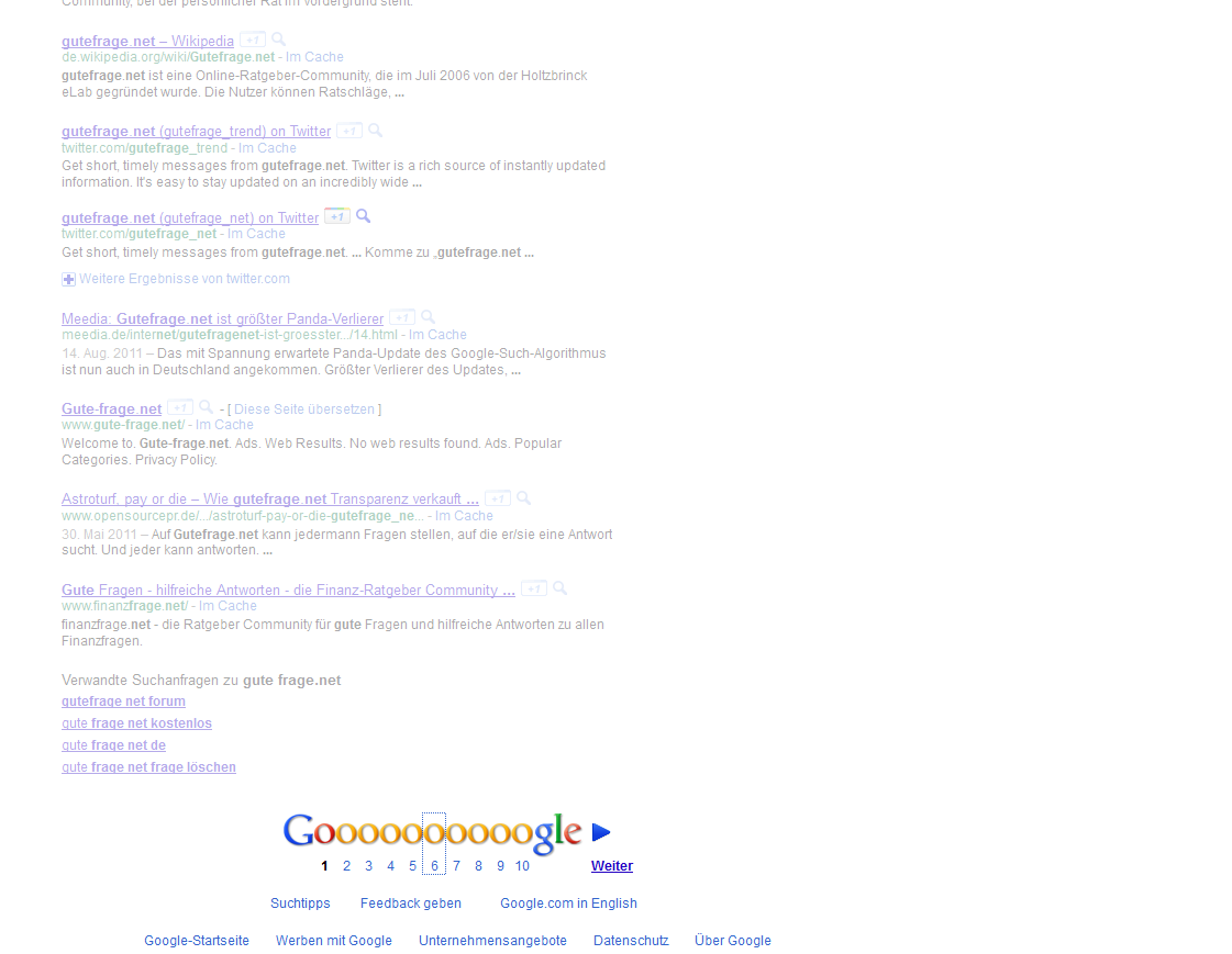 ich habe das Problem, dass wenn ich eine Suchanfrage mache bei google und auf eine weiter seite klicke. Die suche "hängt" Firefox läuft optimal, aber bei der Suche geht es nicht mehr voran. Die Seite ist weisliche bedeckt, so wie sie immer kurzzeitig sich verändert wenn neu geladen wird. Aber ich komme nicht mehr auf die Seite 2 der Suchergebnisse oder sonstige seiten.