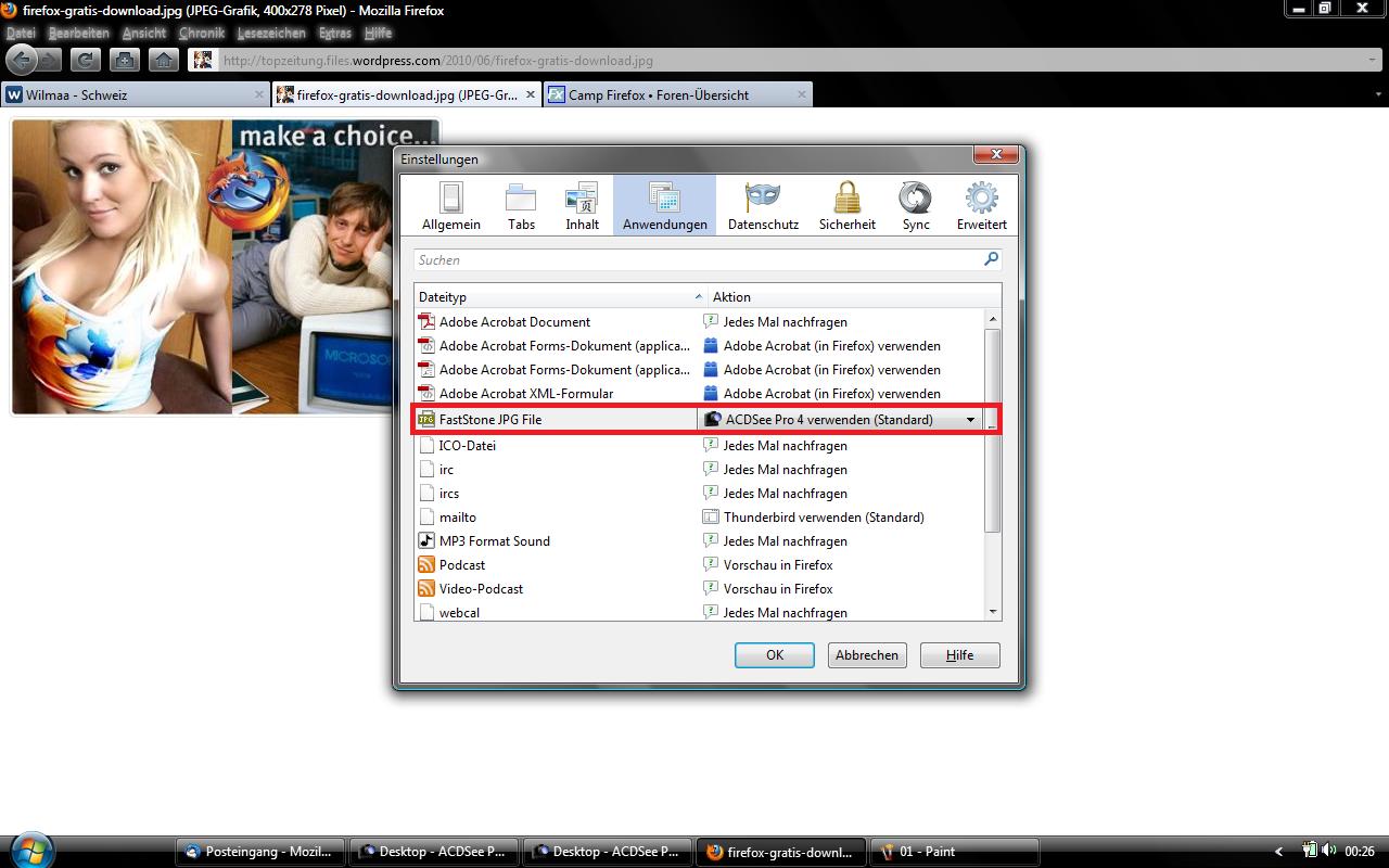 wie kann ich die standardanwendung "FastStone" herausnehmen? dieses programm war vorher auf meinem rechner installiert, habe es nun durch ACDSee ersetzt. jedoch zeigt mir ff6 immer noch "FastStone" an, wenn ich ein JPG aus dem netz downloaden möchte.