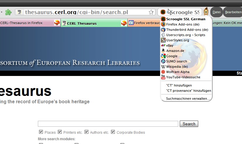 Für den CERL Thesaurus gibt es jetzt eine OpenSearch Description. Damit lässt sich die CERL Thesaurus Suche im Browser als benutzerdefinierte Suchmaschine einrichten. Z.B. in Firefox: