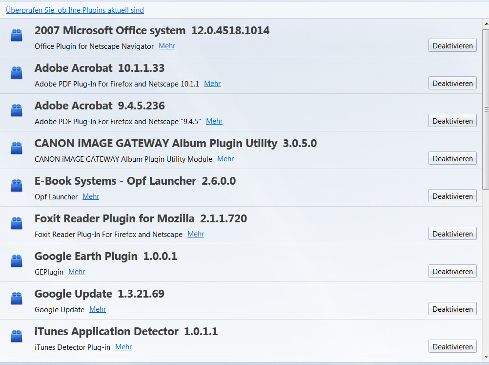 Auch Flash Player Version 11 wurde installiert. Danke ebenfalls.Tut mir leid, daß ich irrtümlich statt der 'Erweiterungen' die Plugins reingestellt habe. Falls immer noch interessiert, kann ich's nachholen.