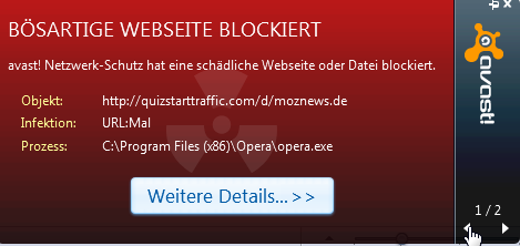Seit gestern erhalte ich ca. alle 20 Minuten von Avast eine Warnmeldung, dass ein Malware URL-Aufruf verhindert wurde: