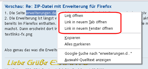2. Die Erweiterung ist längst veraltet. Außerdem benötigst du sie nicht mit nem aktuellen Firefox. Dieses Feature ist bereits im Fierefox enthalten. Das kannst du testen, in dem du erweiterungen.de markierst und nen Rechtsklick drauf machst. Dann erscheint dort im Kontextmenü: