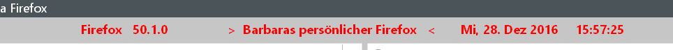 Alles anzeigenfunction doDatUhr() { var days = ["So", "Mo", "Di", "Mi", "Do", "Fr", "Sa"]; var months = ["Jan", "Feb", "März", "Apr", "Mai", "Juni", "Juli", "Aug", "Sep", "Okt", "Nov", "Dez"]; var title = content.document.title; window.setTimeout("try{doDatUhr()}catch(ex){}", 1000 ); var D = new Date(); var day = days[D.getDay()]; var month = months[D.getMonth()]; var year = D.getFullYear(); var hour = D.getHours(); var minute = D.getMinutes(); var second = D.getSeconds(); var date = " " + day + ", " + (D.getDate() < 10 ? "0" +D.getDate() : D.getDate()) + ". " + month + " " + year + " "; var time = (hour < 10 ? "0" +hour : hour) + ":" + (minute < 10 ? "0" +minute : minute) + ":" + (second < 10 ? "0" +second : second); var timestr = date + time + "" + " "; var text ="Firefox 50.1.0 > Barbaras persönlicher Firefox < "; var status = document.getElementById("statusbar-clock-display"); status.setAttribute("value",text + timestr);} //var ClockStatus = document.getElementById("statusbar-display"); var ClockStatus = document.getElementById("helpMenu"); var ClockLabel = document.createElement("label"); ClockLabel.setAttribute("id", "statusbar-clock-display"); ClockLabel.setAttribute("class", "statusbarpanel-text"); ClockLabel.setAttribute("style", "padding-top: 2px;padding-right:85px; padding-left:85px;color:red;font-weight:bold;text-shadow:none"); ClockStatus.parentNode.insertBefore(ClockLabel, ClockStatus.nextSibling); doDatUhr();Die Werte bitte für dich anpassen.