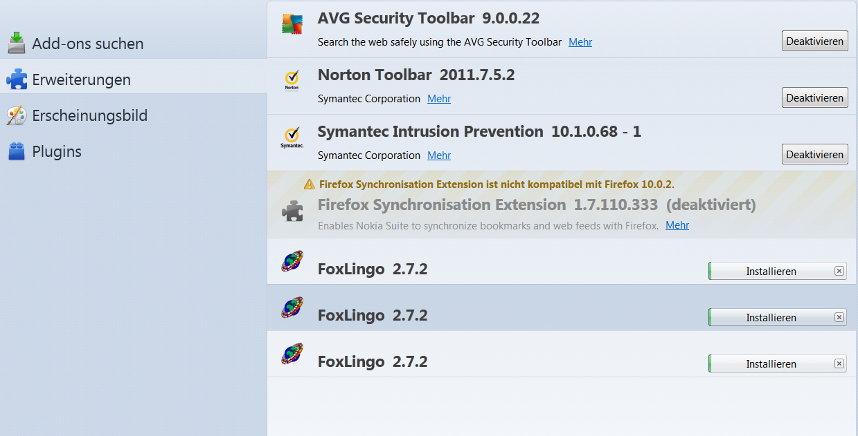 Also: Um nichts auf der Welt lässt sich FoxLingo 2.7.2 installieren. Ich habe es jetzt mittlerweile 4 x in meinen Erweiterungen im Firefox 10 stehen und kann keinen der vier vorhandenen "Installieren"-Button auslösen.